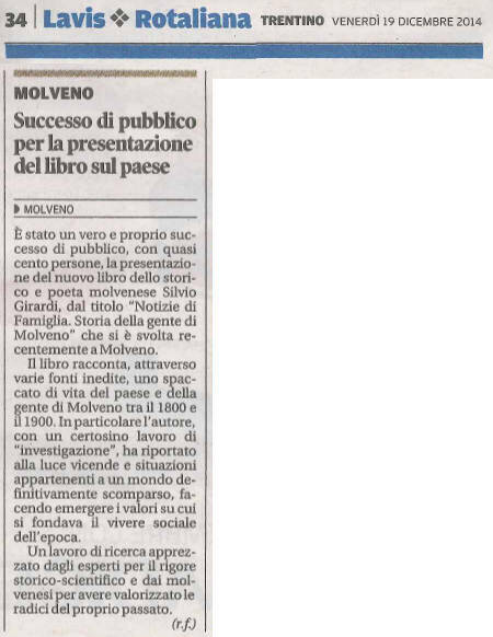 Home » Aree tematiche » Biblioteche della Paganella » Rassegna stampa » Molveno - Successo di pubblico per la presentazione del libro sul paese