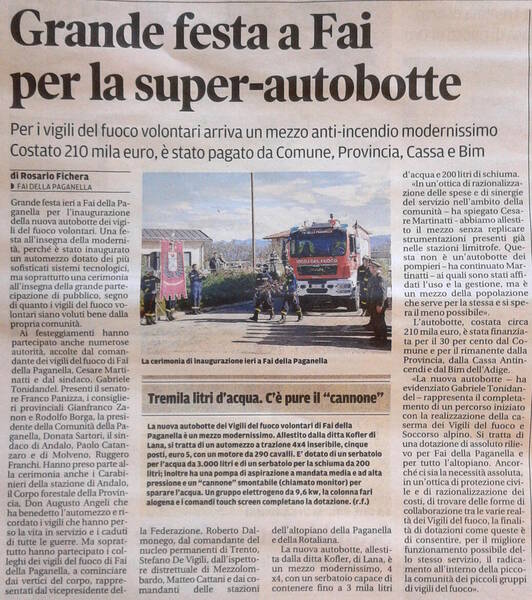 Home » Aree tematiche » Vigili del Fuoco Volontari » Rassegna stampa » Grande festa a Fai per la super-autobotte